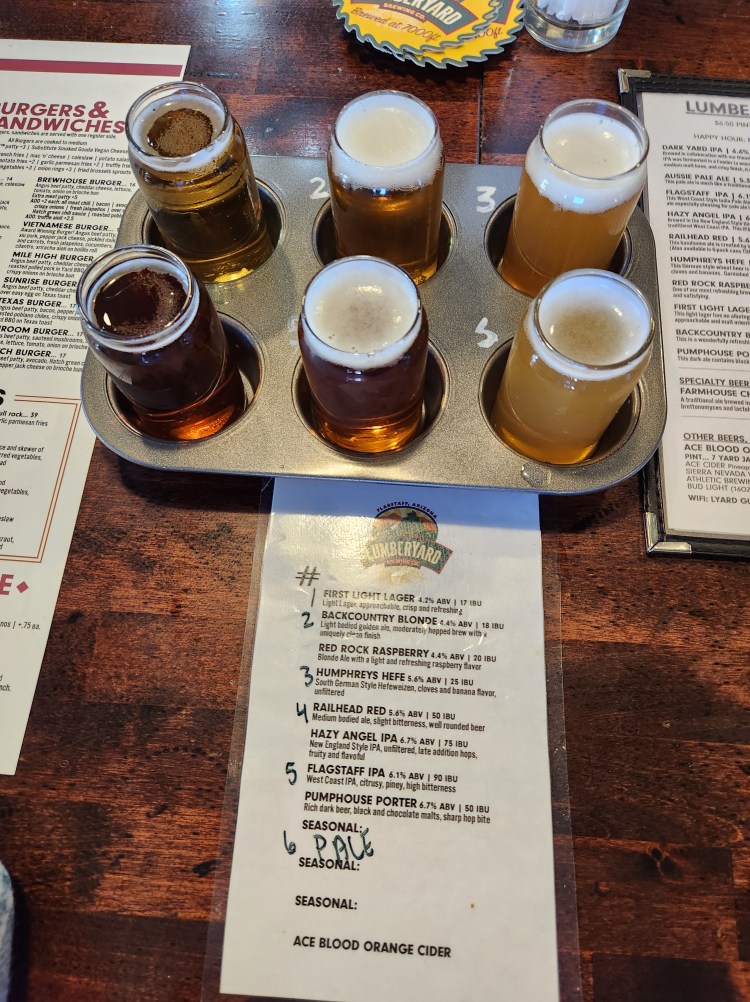 Before I digress further, I was talking about another visit to Flagstaff. Primary Objective: Pain meds! On ‘pharmacy and computer day’, we also checked out a couple of more breweries. “Dark Sky Brewing Company” was okay, but the beer list was limited and not spectacular. We went to another one called the “Lumberyard Brewing Company” and were quite pleased.