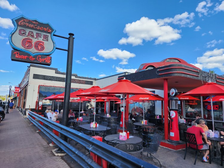 I will break with chronological reporting and discuss some of the other spots we visited in Williams, then finish with our trip to the Grand Canyon. Williams is also home to the “Grand Canyon Winery” located only a couple of doors down from Historic. We (I) tried a flight of their wines, and they were all great! Ryan, our “host” was a relatively new local, but with past travels and experiences was a fount of knowledge! Appreciate all the info! Wine and company were great and we walked away with some red and white for later reminiscing! We stopped in a couple of gift shops, notably the “Thunder Eagle” where Tina discovered the hand-crafted silver and stone jewelry. Happy Mothers’ Day! 😊 I believe the “Olive of the Best” olive oil and vinegar store also enjoyed our presence. No complaints – Tina is an EXCELLENT cook, and all supplies are welcome! (She also found an Asian Market in Flagstaff!) We made a brief stop at “Cruiser’s Route 66 Café” and finished with the world famous “Sultana Bar.”
