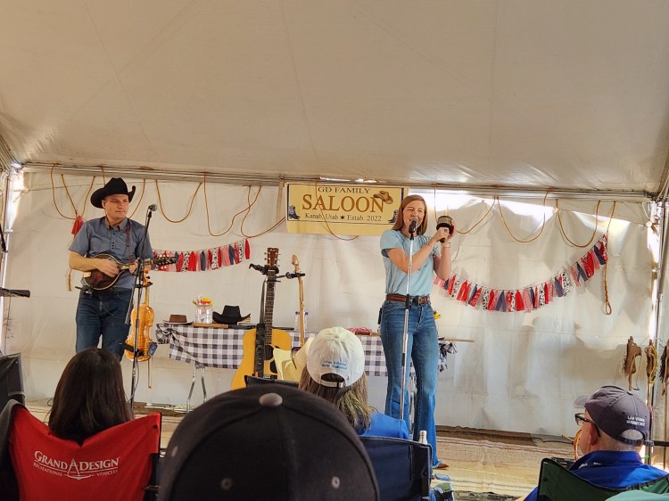 As I mentioned in the beginning, our primary goal for Kanab was the owner’s rally. The Wagon Masters (event coordinators), Scott and Denise, did a FANTASTIC job pulling off one of the more fun rallies we have attended. A cowboy themed event, it was filled with great social events, entertainment, vendor lectures, food and meeting folks who share a passion for the RV lifestyle. The highlight of the entertainment was the “W Duo.” The multi-talented couple, Russell and Lyndsey Wulfenstein, played guitar, banjo and fiddle while singing and performing much of their original music. Russell’s mastery of the fiddle are remarkable, and Lyndsey’s vocals (along with her own instrument playing) were awesome! We also enjoyed the ‘Cowboy Poet’ Carl Anderson who entertained us with original poetry and song derived from the old cowboy days spent on the range and ranch. It was both funny and educational! We were also happy to see Dave and Stephanie from our Tucson stop and make new friends with Mike and Andi!