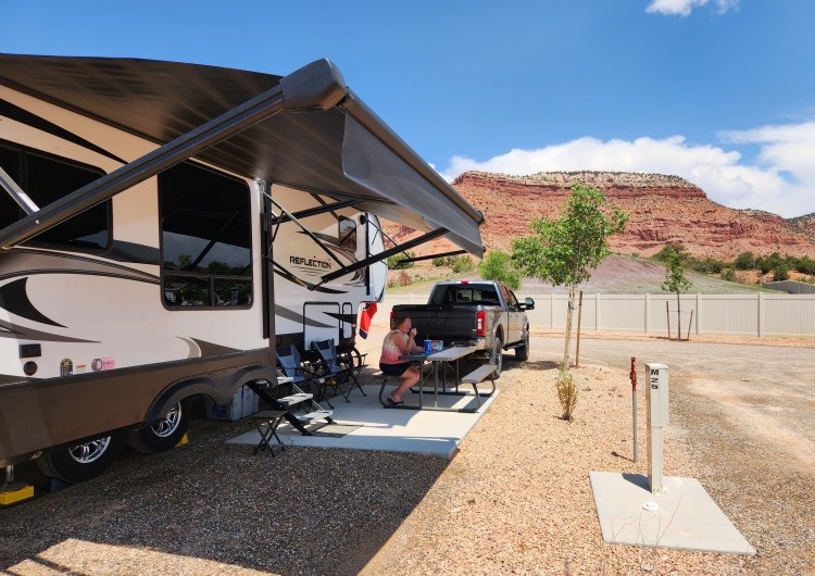 The rally was held at the “Grand Plateau RV Resort” in Kanab and is a spectacular location if you are ever this way. It is light on shade (trees are growing) but is very clean and well-kept. All the sites are level gravel with concrete patios. There is an upper and lower area with the upper sites providing a slightly better view of the surrounding countryside. The spacing is not huge but is adequate and comfortable. There is a small store at the office, a pool, a hot tub and pickle ball courts. The laundromat is top notch and we used it a couple of times during our stay. The only negative for us was connectivity. Not sure about others, but the T-mobile tower is behind one of the buttes and the signal was not always good. And not that we spent much time in the trailer, but the park does not offer cable and local over-the-air channels do not exist. Despite this small inconvenience, we loved the park and its surrounding beauty. It is privately owned and operated, and the staff were great from check-in to departure. Great place to call home for a few days while you explore!