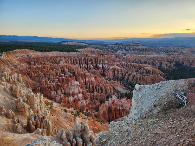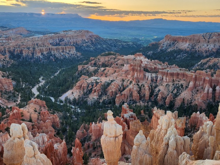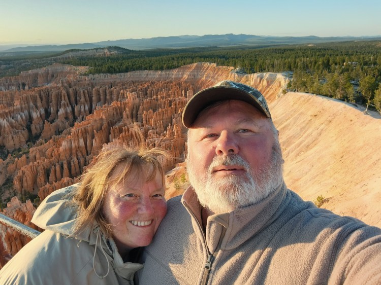 I mentioned the day was planned, which included watching sunrise, taking a short 5-mile hike around the ‘Amphitheater,’ and then enjoying the 18-mile drive stopping at various scenic overlooks. We hit 2 out of 3! The hike fell off the list shortly after arriving at ‘Inspiration Point’ and hiking to its highest of three overlooks. We decided that hiking at 9,000 feet was not in the best interest of those used to living at an elevation closer to 900 feet! We did make the drive where we enjoyed some spectacular views of natural rock formations, and we have the photos to prove it! For the record, we did still log some mileage walking from parking lots to viewing spots. Fitbit says so!!!