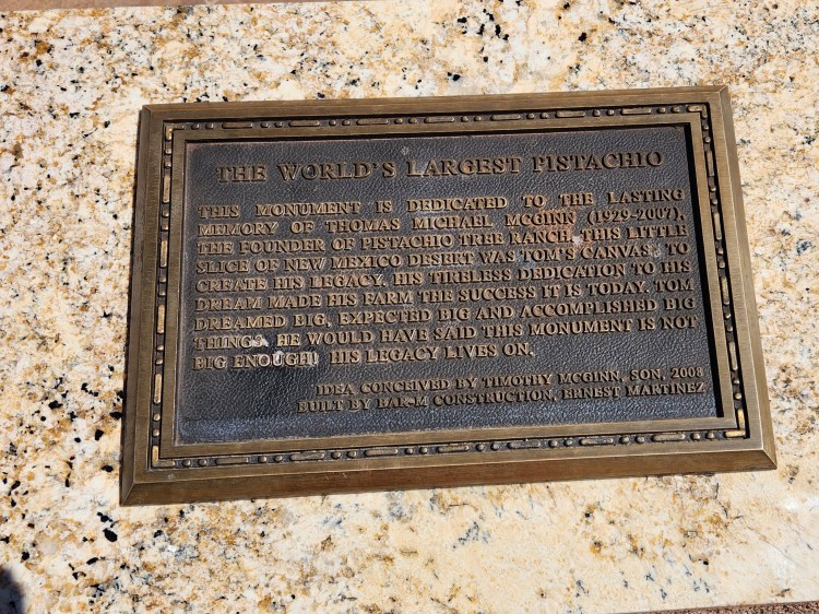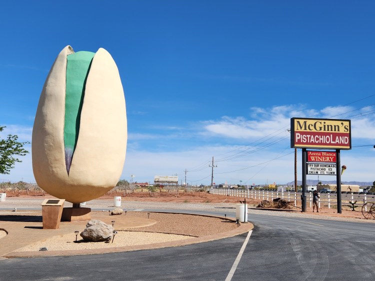 Our first stop was at a roadside store known as McGinn’s “Pistachio Land” located just outside of Alamogordo and home of the world’s largest pistachio! We were fortunate to meet the owner, Tim McGinn and get a quick history of the business. The original orchard was established in 1980 by Tim’s Dad. It is still a family run operation that has expanded to a small vineyard/winery and pistachio ice cream production! We passed on the wine – shocker, I know, but we did enjoy the ice cream! It was delicious… if you are a fan of pistachios! The General Store offered the standard array of souvenirs and several options in the flavors of pistachios! We most enjoyed – and purchased – bags of the ‘Spicy’, ‘Roasted and Salted’, ‘Green Chili’ and some of their ‘Ultimate Pistachio Brittle’. It was quite the tasty stop and worth the time if you are in the area!