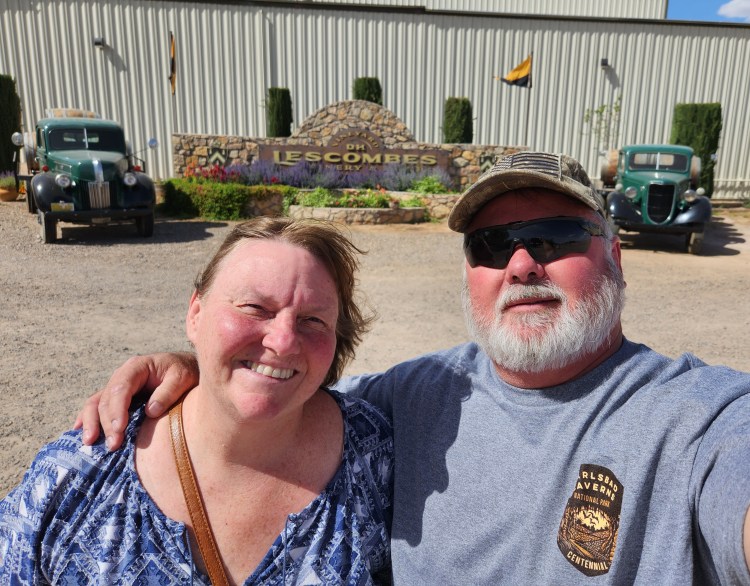 We rounded out our day with a visit to the “Lescombes Winery” only a few miles from the campground. The first discovery was to learn that the winery is a “Harvest Host” location. Naturally, we happened to run into some campers and had great conversations with Bob and Pat who are currently serving as officers with the “Family Motor Coach Association (FMCA)” and are on their own full-time adventure! We also met Terry and were enlightened with information on some sites to see during our upcoming stops. I am sure you will be reading about them in the near future!