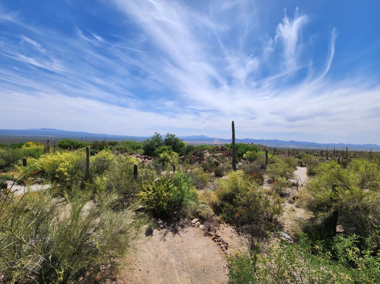 While the rally was the primary event for our Tucson visit, we did manage to see and do several other things. One of our main activities to do when we can, is to take a bike ride. Tucson has several connected trails – some better than others – that wind their way through town. We ended up taking a leisurely hour-long ride through the Sonoran Desert landscape on the Diamond St trail portion of the “Chuck Huckleberry Loop” in and around Tucson. The ‘Loop’ extends through unincorporated Pima County, Marana, Oro Valley, Tucson and South Tucson. Good ride for sure, but we started later than we should have and had to expedite to beat the afternoon sun and heat!