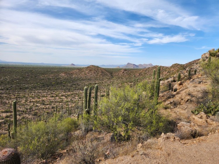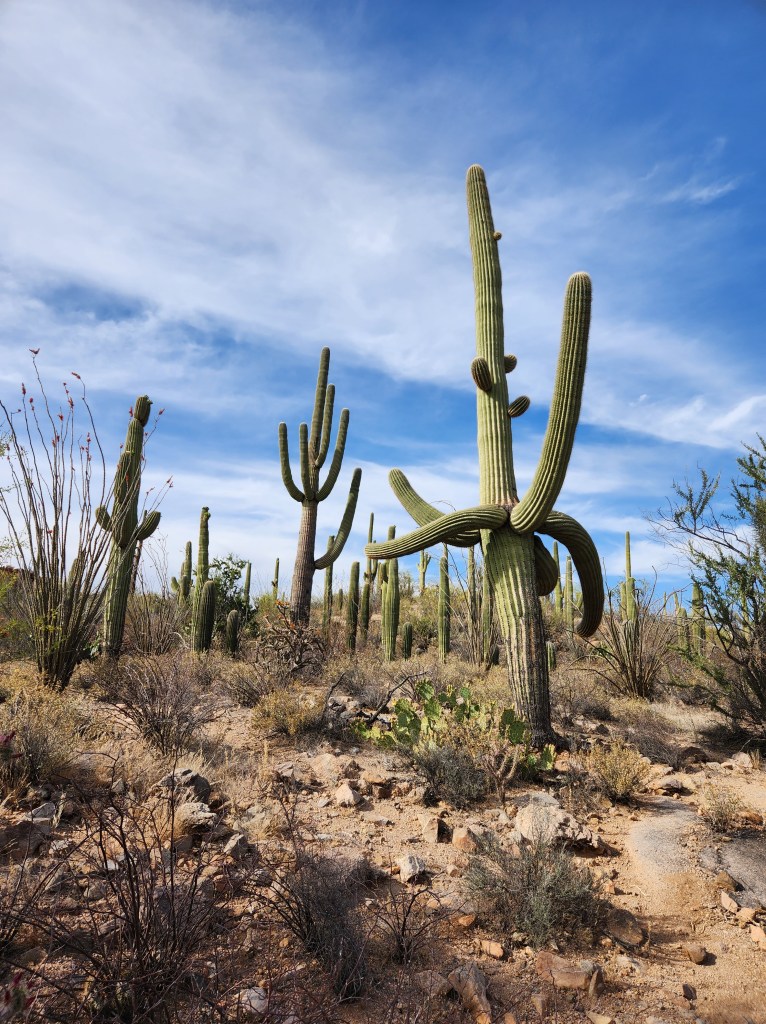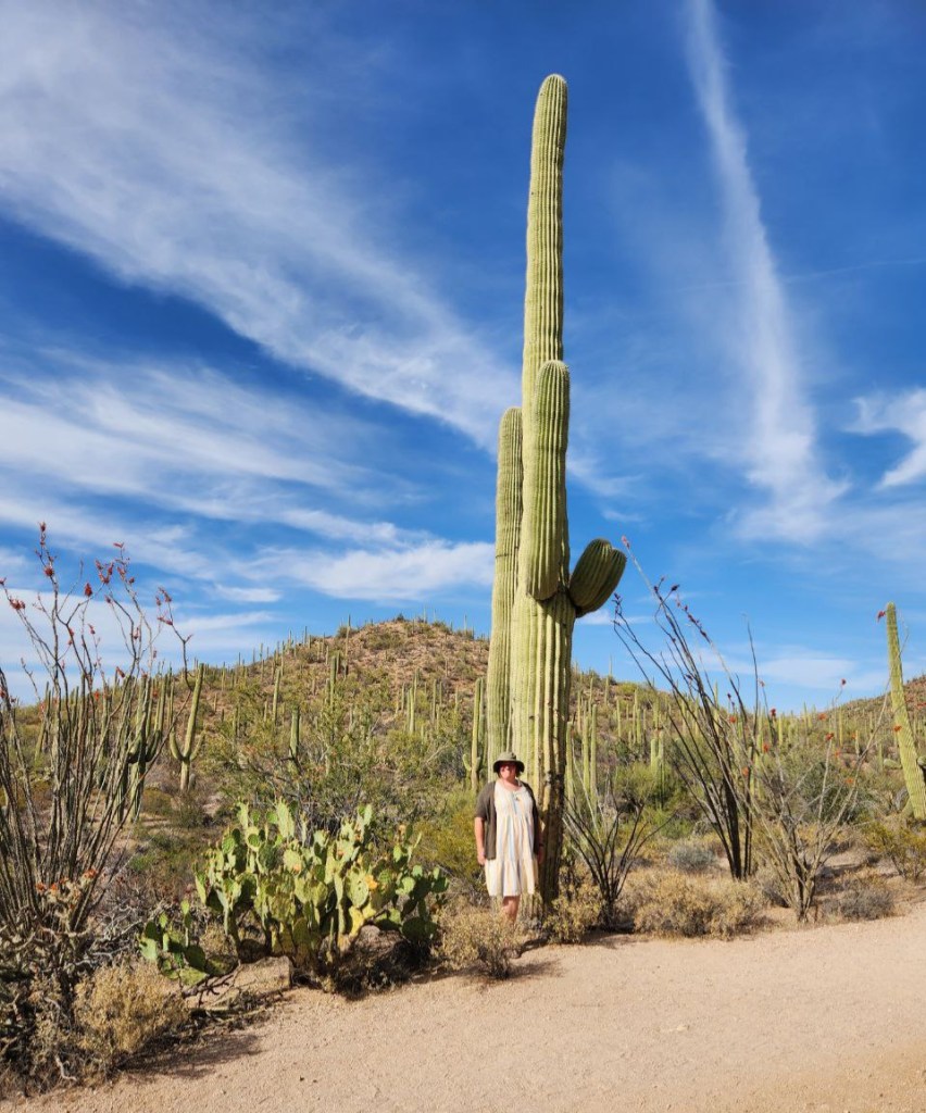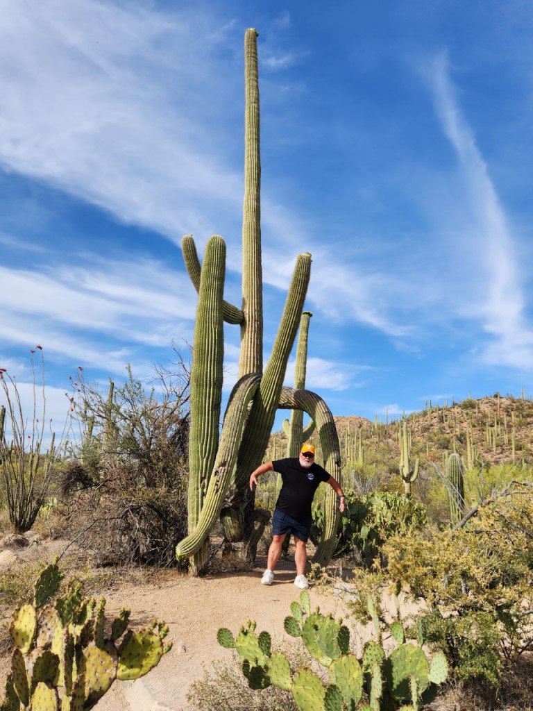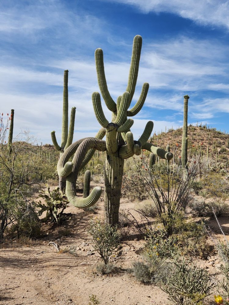 Our last stop for our time in Tucson was at the “Saguaro National Park” not far from the Sonoran Museum. The saguaro cactus is quite fascinating now that I have learned more about them than I had ever thought possible from Bob, the docent! Check out the website or research the cactus itself and I am sure you will also be saying… ”Hmmmm” over and over again! Just a snippet of a teaser to get you going… the saguaro cactus only grows in the Sonoran Desert and actually has a wooden ‘skeleton.’ A small 4-5 foot tall plant is about 35-40 years old and the cactus does not develop the ‘arm’ sprouts until it is at least 60 years old! There is much, much more and this National Park is another must see if in the area!